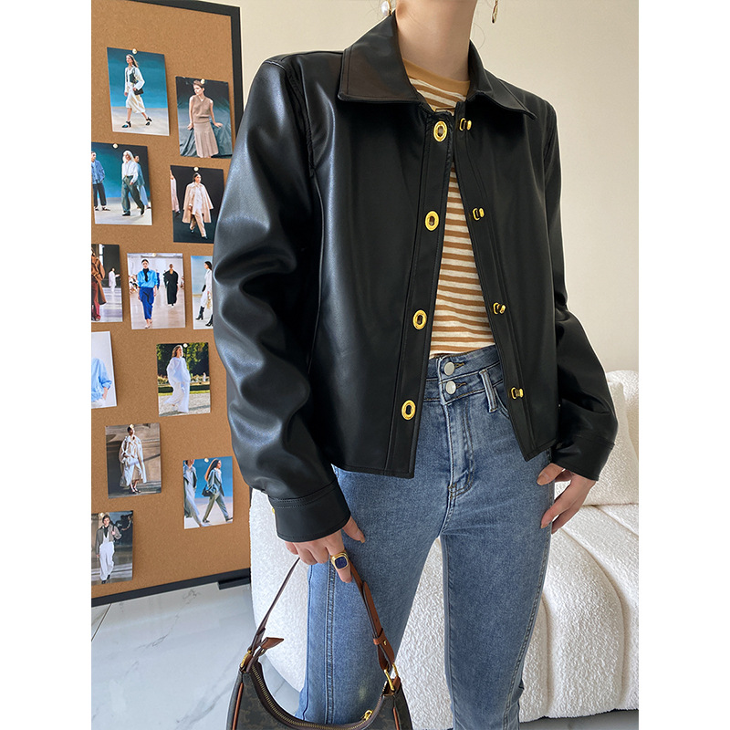 Sinan French Small Gold Button Lapel Leather Coat Short Design Niche 2024 Early Spring New SN1914