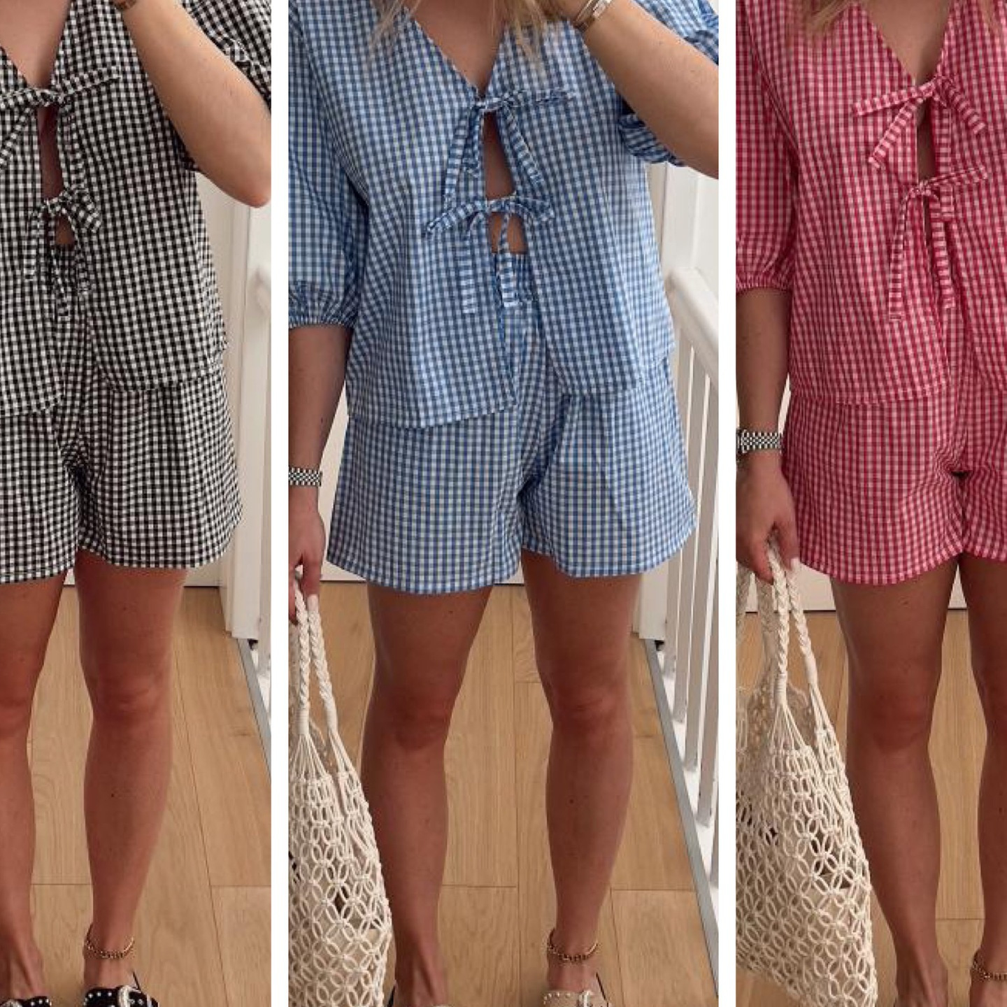2024 European and American Cross-border Summer Women’s Lace-up Plaid Top Set Casual Elegant Loose High Waist Wide-leg Pants