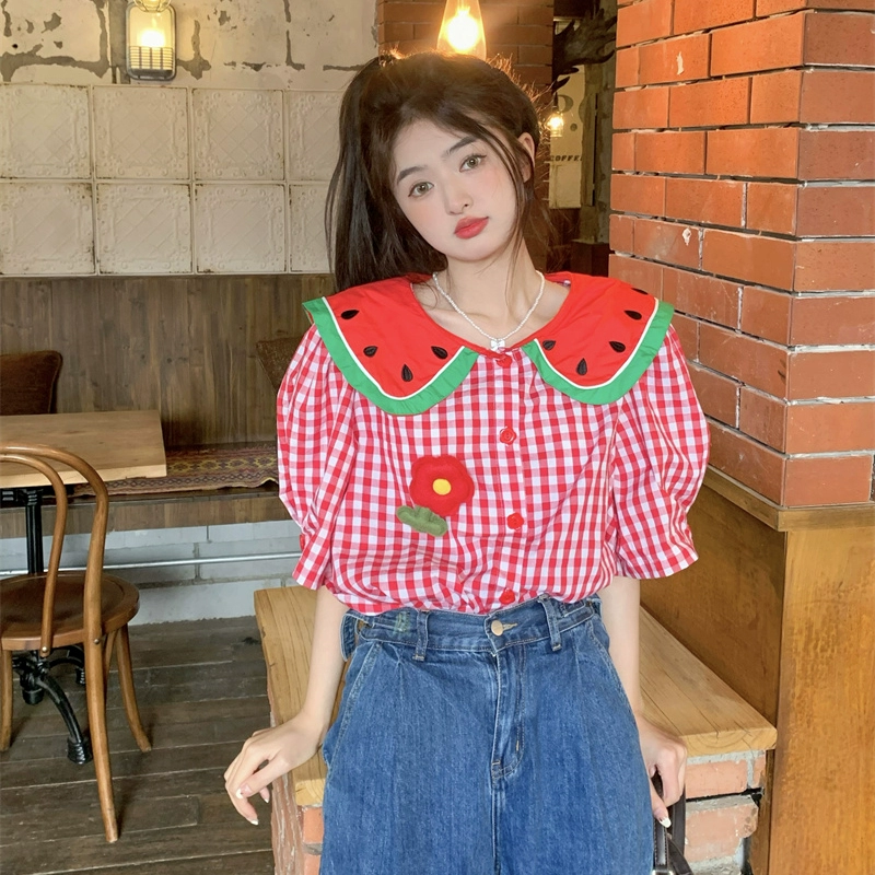 mm plaid doll collar small flower short-sleeved shirt embroidery