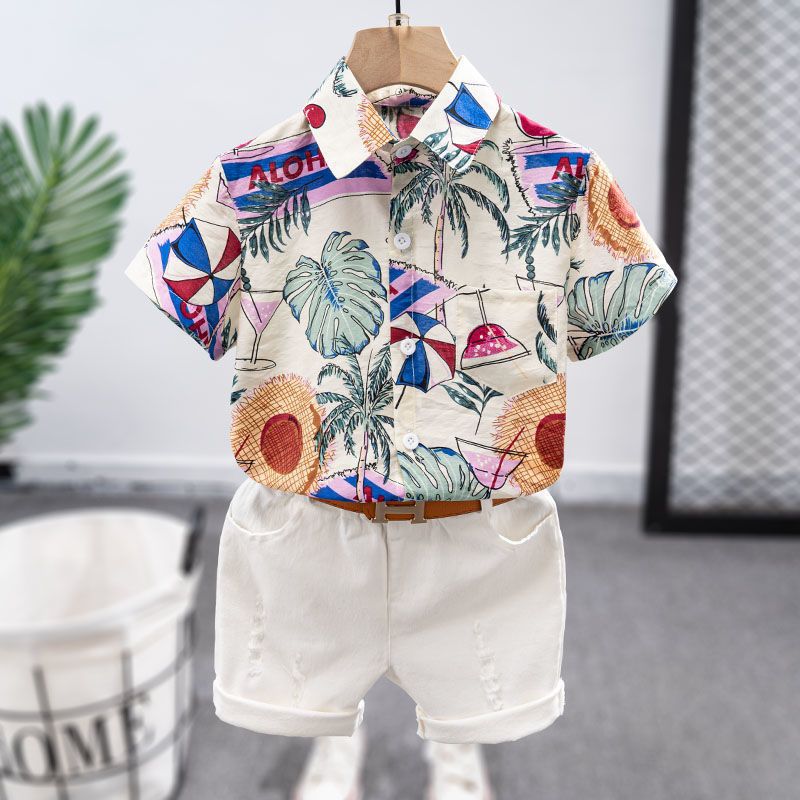 Boy’s Pattern Shirt 24 Summer New Boy’s Handsome Cotton and Linen Green Flower Shirt Children’s Western Style Short Sleeve Top