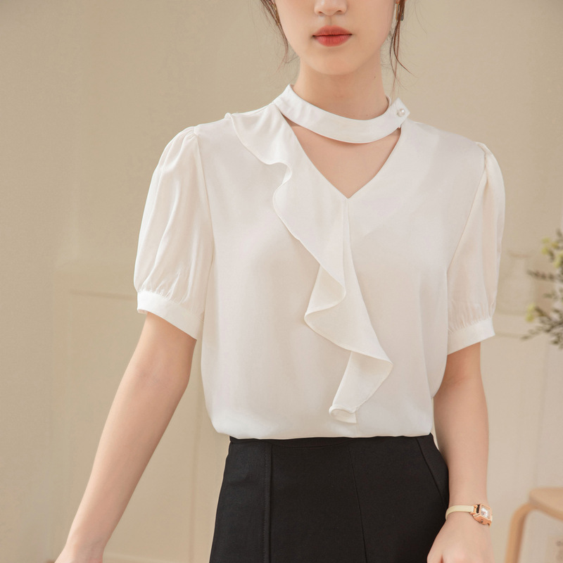 Real Shot Elegant Niche Jane Short-sleeved Shirt Women’s 2024 Summer New French Satin Draped Commuter Professional Top