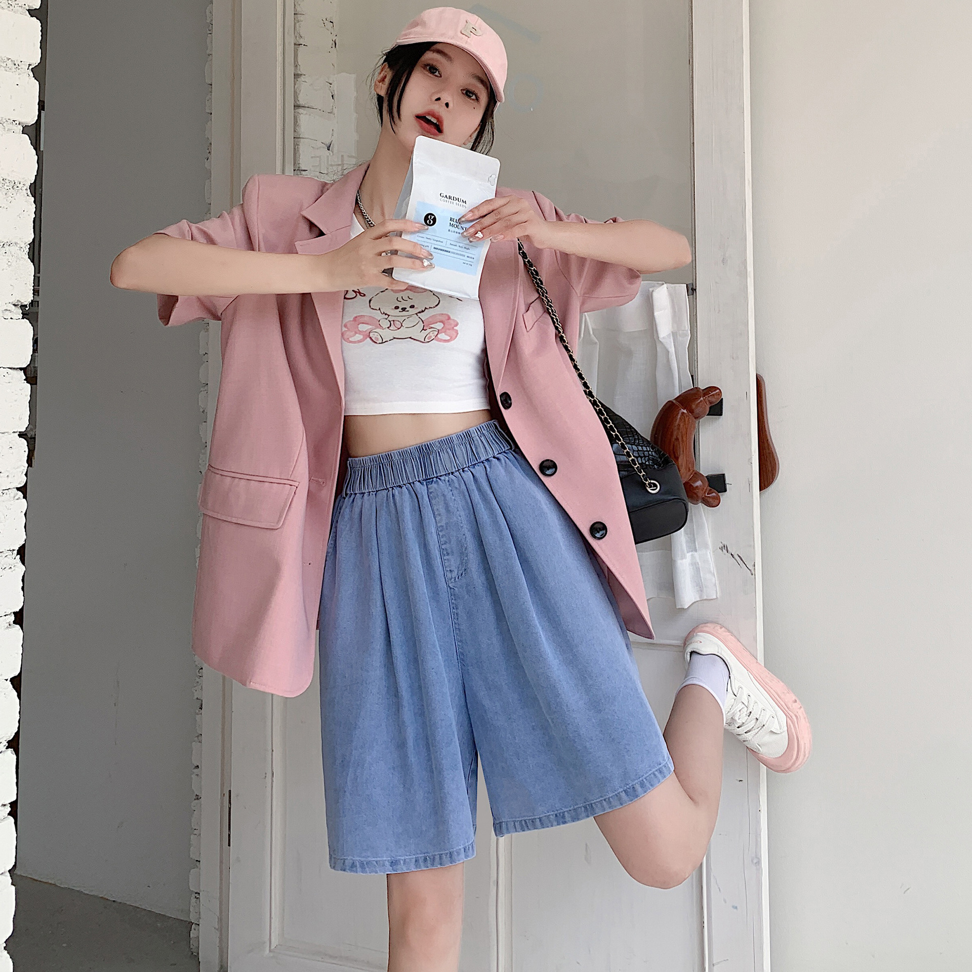 Tencel Soft Denim 2024 Summer High Waist Dipped All-match Slimming Casual Shorts Loose Wide Leg Pants