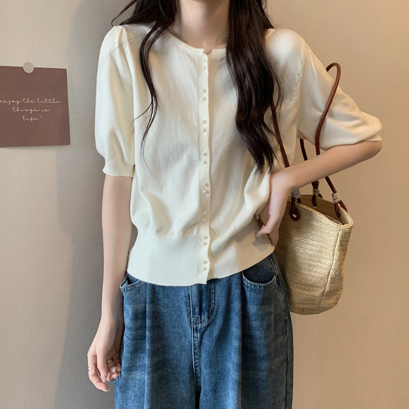 plus size Chubby Beaded Single-breasted Short-sleeved Knitted Top Women’s Summer Belly-covering Slimming Western-style Puff Sleeve T-shirt
