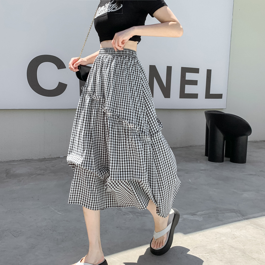 Japanese Cotton Linen Plaid Skirt 2024 Summer Mid-length Plaid High Waist Slim-fit Vintage A- line Skirt