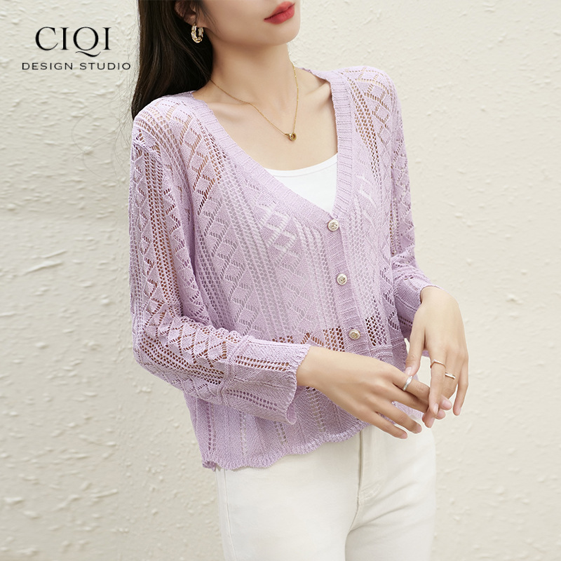 2024 Summer New Women’s Short Loose Knitted Cardigan Long-sleeved Thin Hollow Sunscreen Shirt