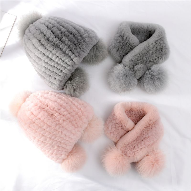 Korean Style Rex Rabbit Fur Hat Women’s Winter Warm Ear Protection Boys and Girls Straw Hat Scarf Baby Cute New Style