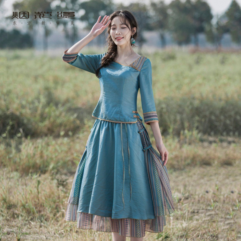 Zen style suit 2023 Autumn New retro ethnic style skirt new Chinese national style two-piece set Love