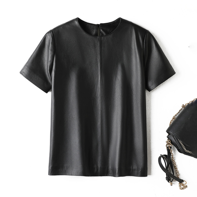 Genuine Leather Spring New High-end Black Sheepskin Short-sleeved T-shirt Women’s Elegant Age-reducing Short Top