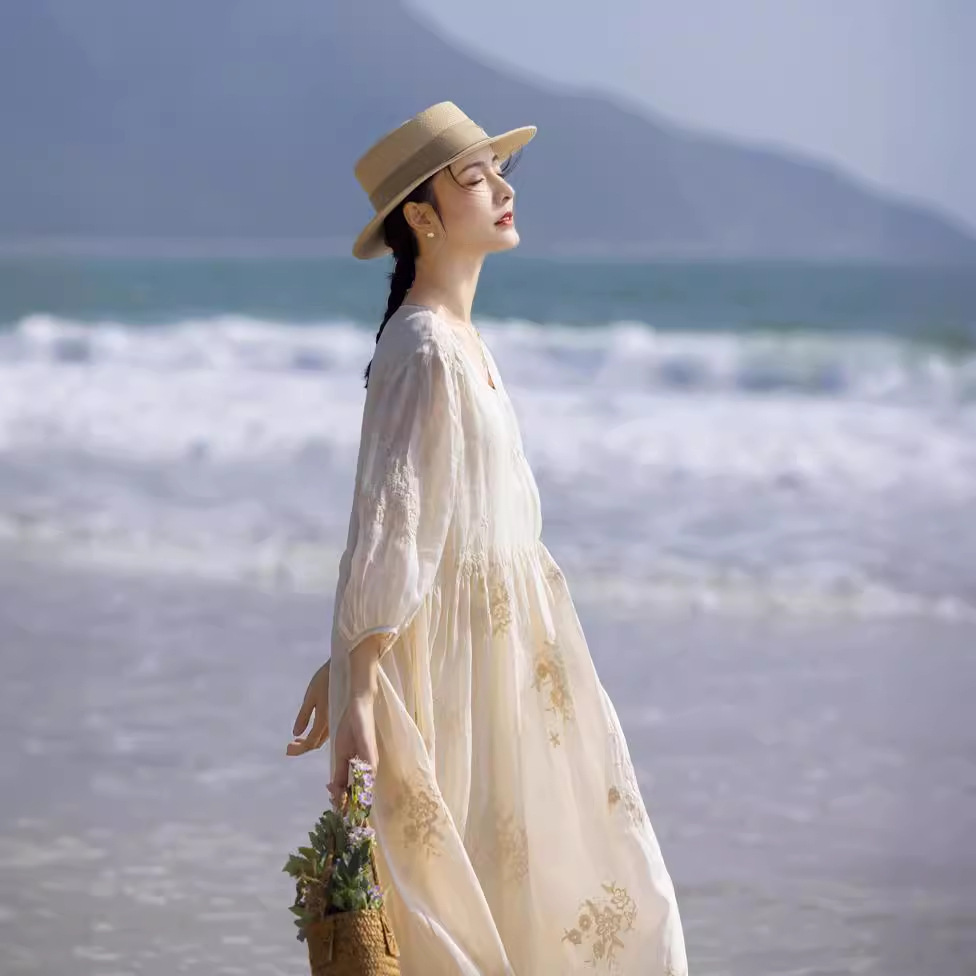 2024 spring and summer loose Ramie high-end heavy embroidery French V-neck travel elegant fairy white dress