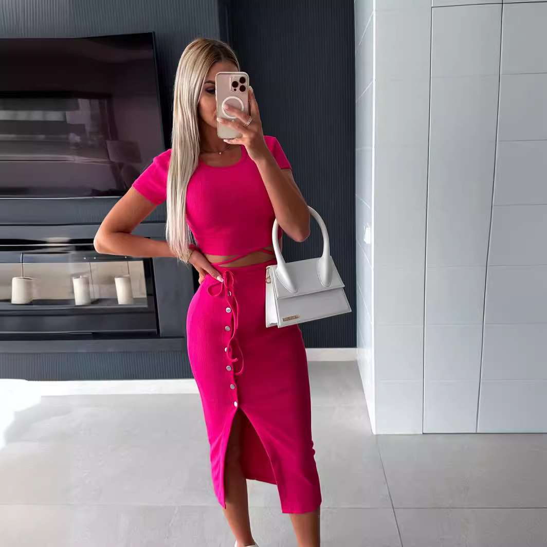 Cross-border foreign trade European and American women’s clothing 2023 autumn and winter short sleeve round neck suit button navel hip skirt casual two-piece suit