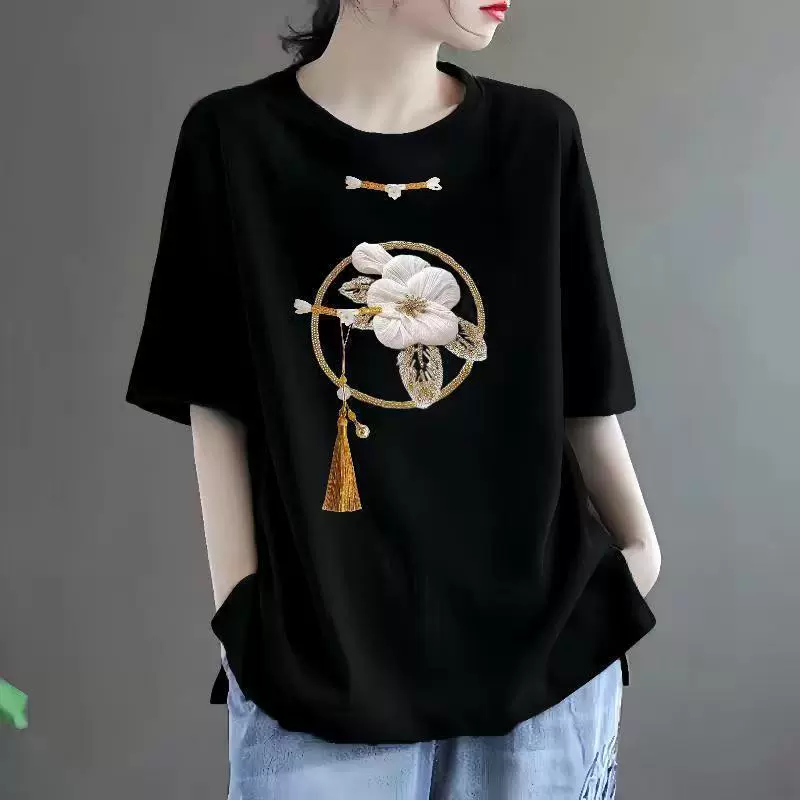 Short -sleeved loose print Middle -aged mother installs ins T -shirt