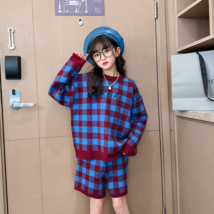 2024 middle school children’s spring new suit fashionable foreign style female students plaid sweater shorts two-piece set of trendy foreign trade
