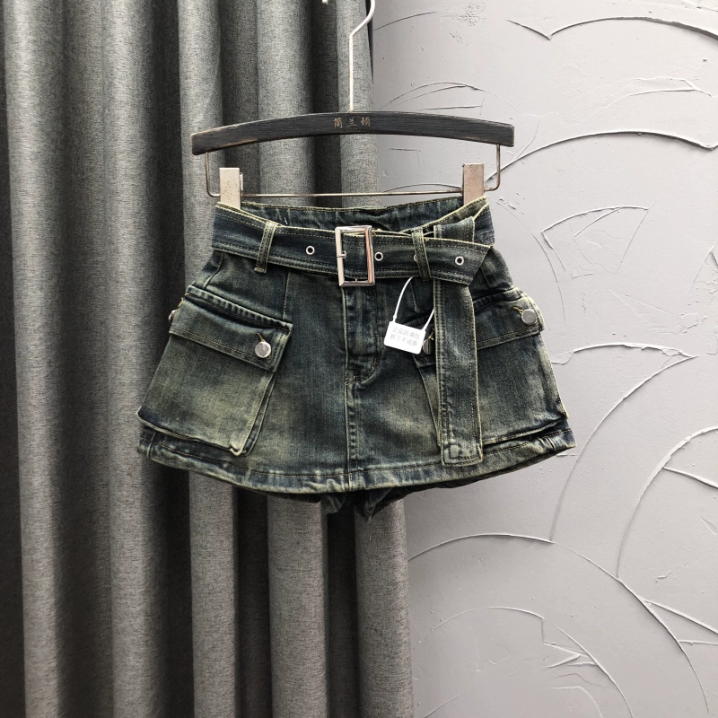 High-waisted denim shorts skirt fashionable wide-leg fake two pieces