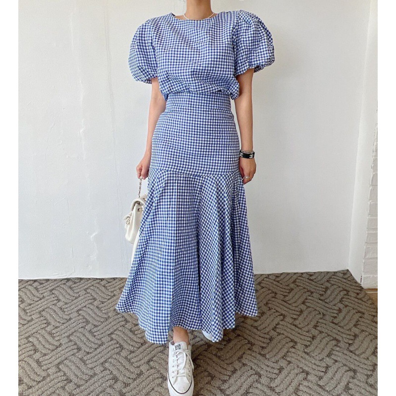 Spot chic Korean style summer casual short plaid bubble sleeve top high waist A- line lotus leaf plaid skirt