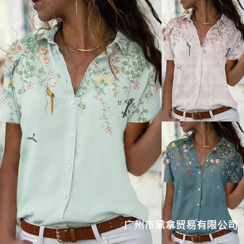 A large number of spot 2023 cross-border independent station women’s fashion printed top casual short sleeve loose button shirt