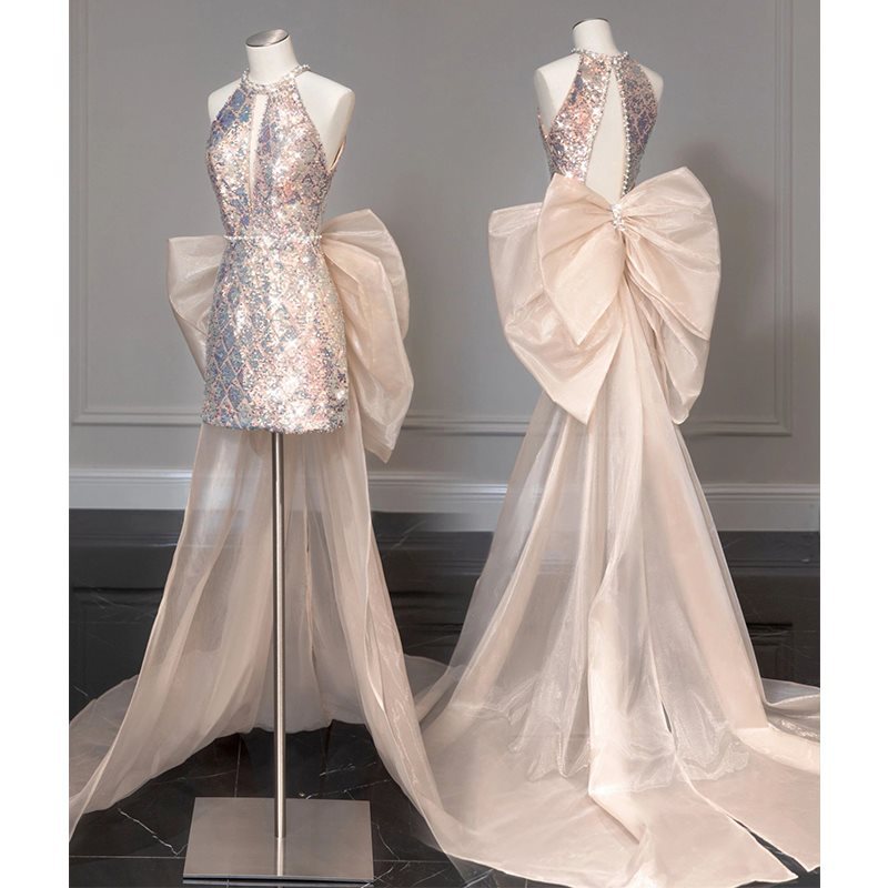 Pink Sequins Evening Dress Female Sexy Shining Bride Wedding Toasting Dress Banquet Host Fishtail Sling