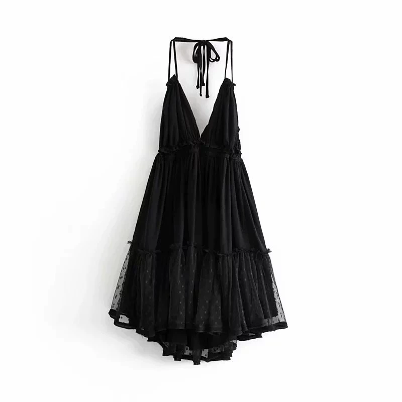 Street photography American sexy new slim lace splicing deep V backless halter halter palace style dress