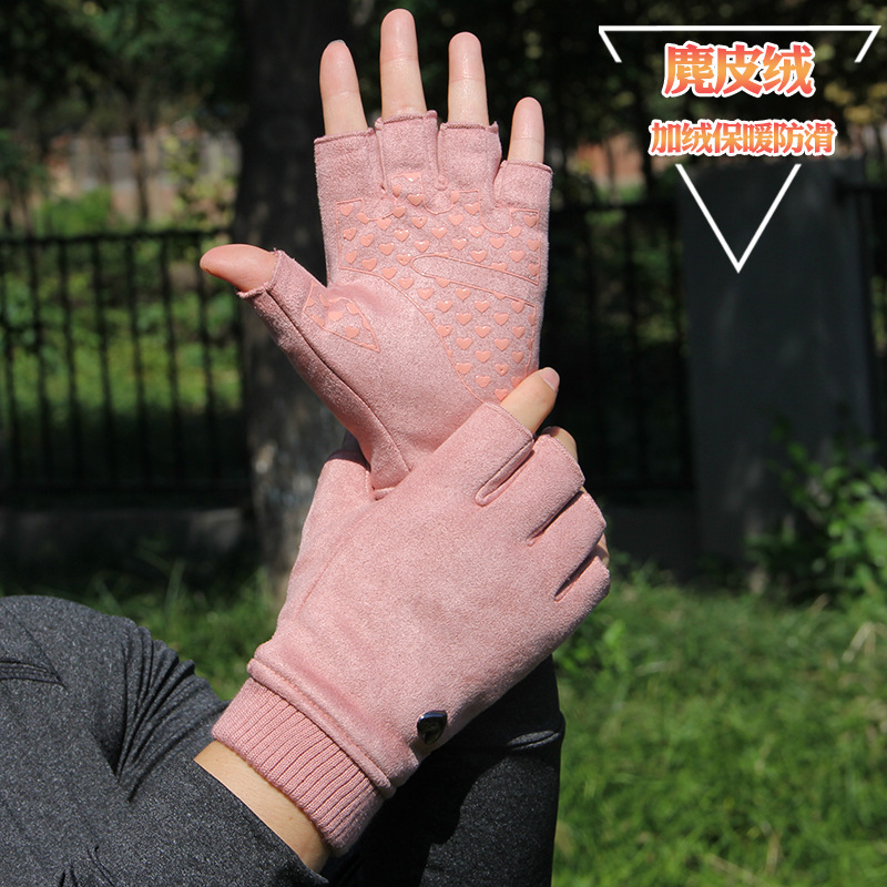 Autumn and Winter fleece-lined warm half finger gloves women’s suede half half men’s driving outdoor riding non-slip open finger