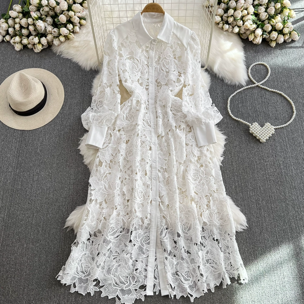 Luxurious crocheted lapel hollow lace dress