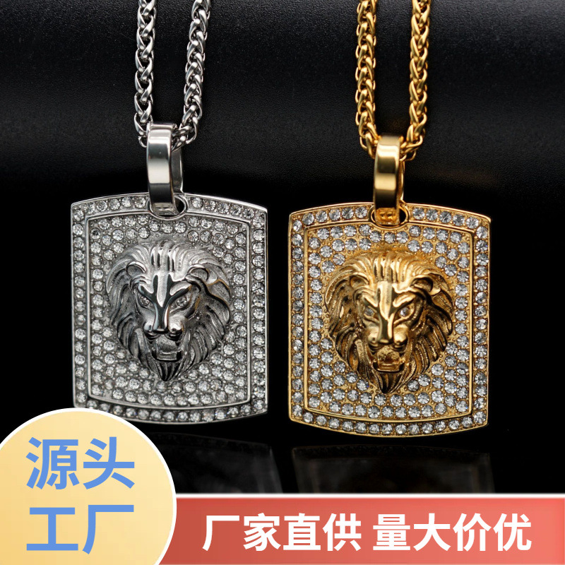 Europe and the United States cross-border hot hip hop HIPHOP jewelry titanium steel gold plated full diamond lion head tag pendant