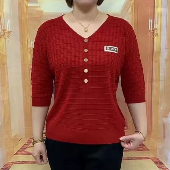 New V-neck bottoming knitted sweater, summer thin, fashionable three-quarter sleeve mother’s wear, loose, slim and versatile top