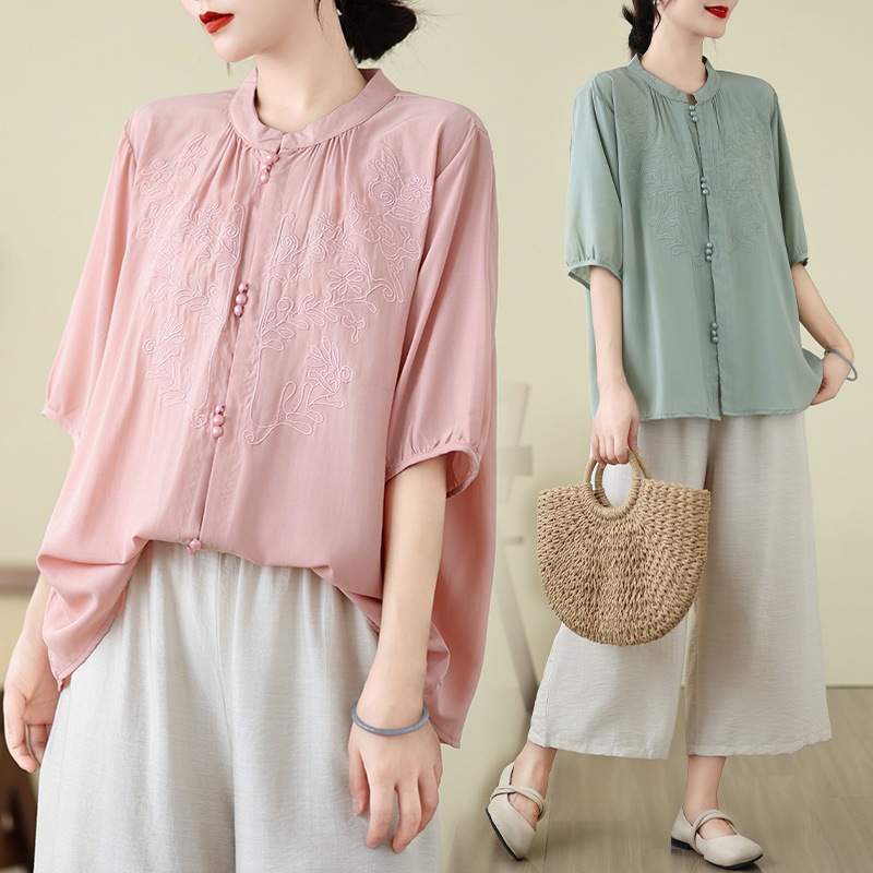 Real Shot in stock 2024 Summer New Arrival Loose plus size Shirt Women’s Round Neck Embroidered Cardigan Single Piece Nail Top for Women
