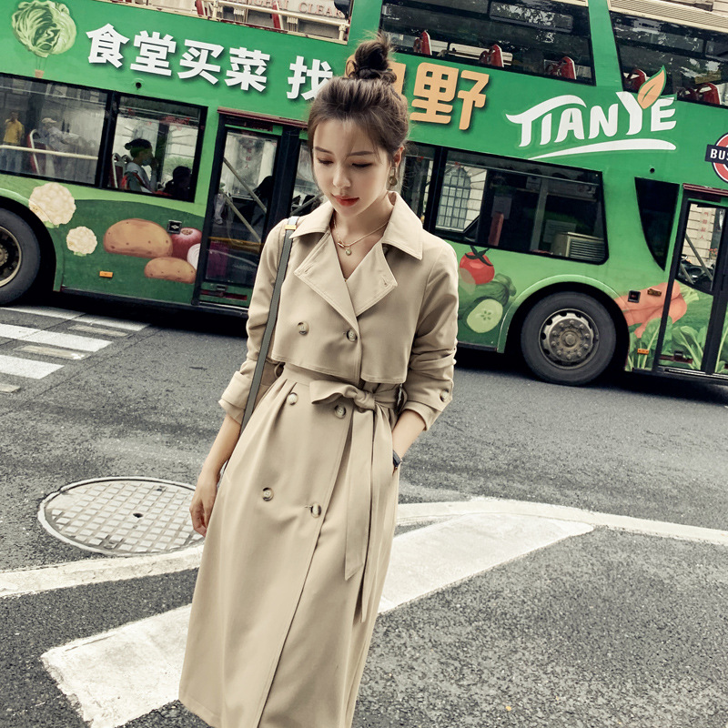 Wholesale fashionable loose large lapel double-breasted lace-up waist British-style slimming mid-length apricot trench coat for women