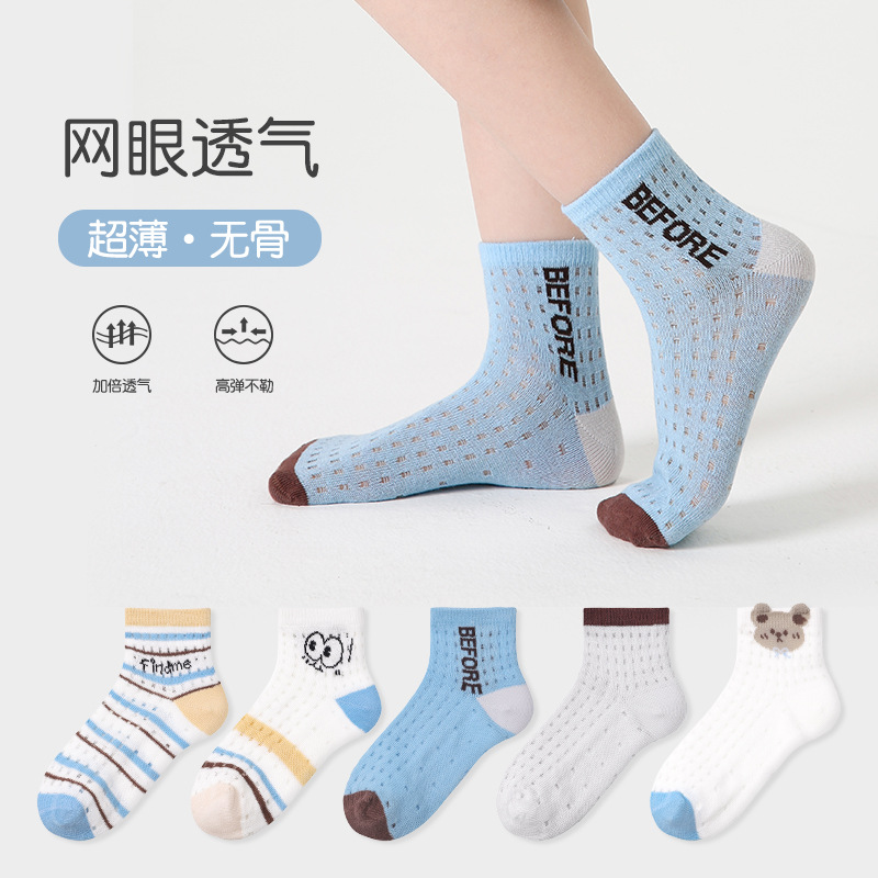 Cartoon children’s socks wholesale 2024 spring and summer thin letters bear mesh socks boneless cotton breathable boys socks