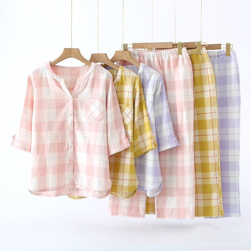 Summer Simple Japanese Style Plaid Women’s Pajamas Cotton Gauze Thin Short-sleeved Ankle-length Pants Outwear Home Suit