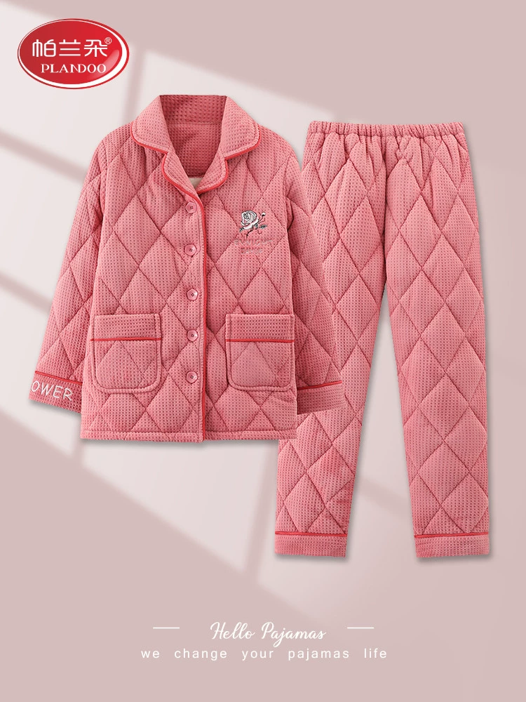 Palan Dot coral velvet pajamas Female winter thickened plus velvet three -layer cotton fasteful Franchang Francho middle -aged mother home clothing