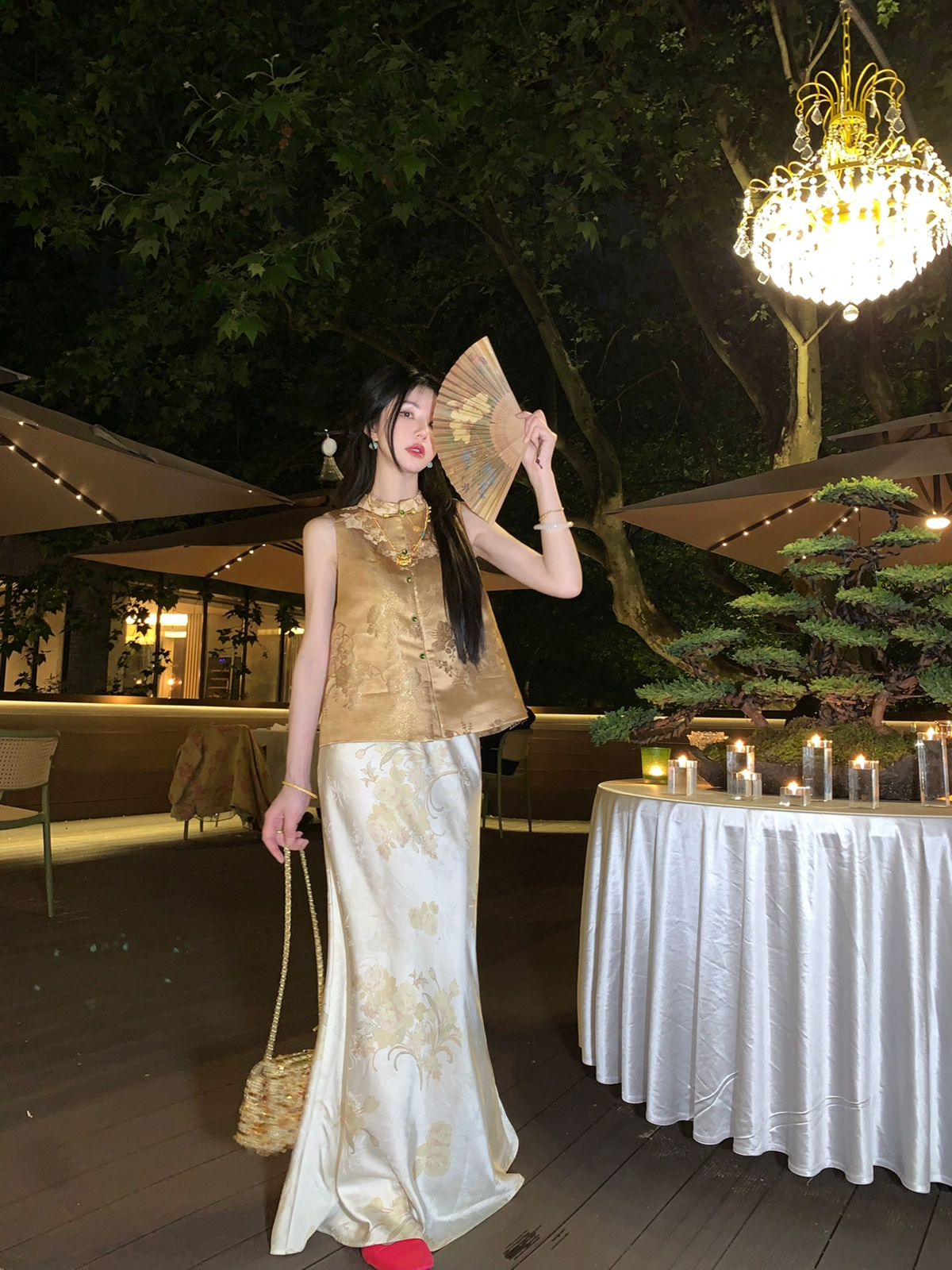 MOSS STUDIO [Pear Blossom Fan] New Chinese style Zen jacquard print white midi skirt for women