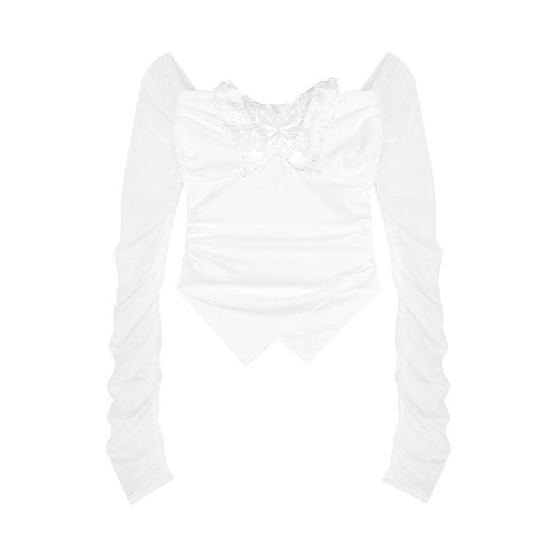 Butterfly long-sleeved patchwork sexy white top with mesh