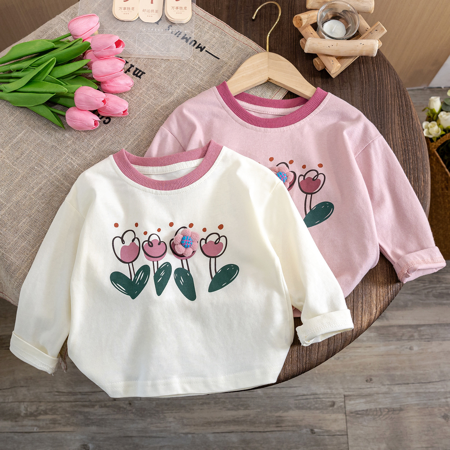 Girl’s Autumn 2023 New Autumn Western Style T-Shirt Baby Girl’s Long Sleeve Printed Base Shirt 500 Match Contrast Color Top