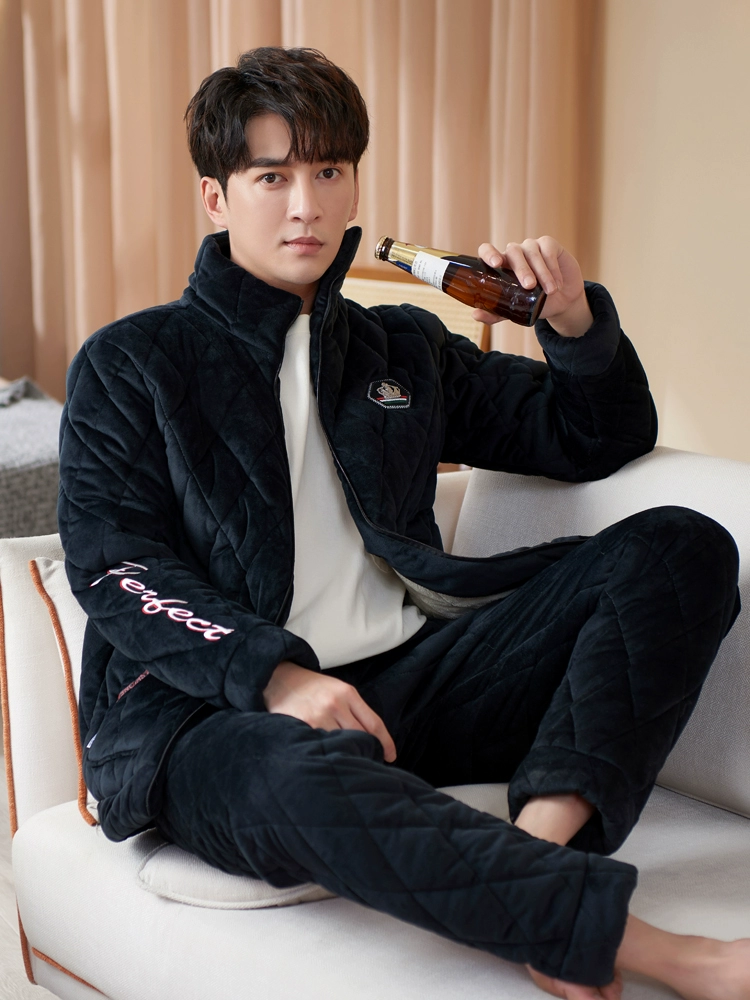 Men’s pajamas in autumn and winter thickened and velvet coral velvet three -layer cotton jacket Flat velvet can wear home clothing suits