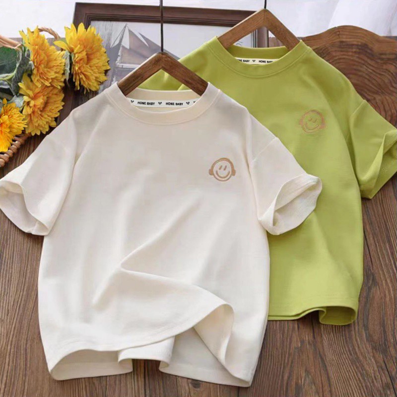 2024 Summer Children’s Casual Crewneck Short-sleeved Shirt with Smiley Embroidered Boys’ Middle and Big Children’s All-match Half-sleeved Top