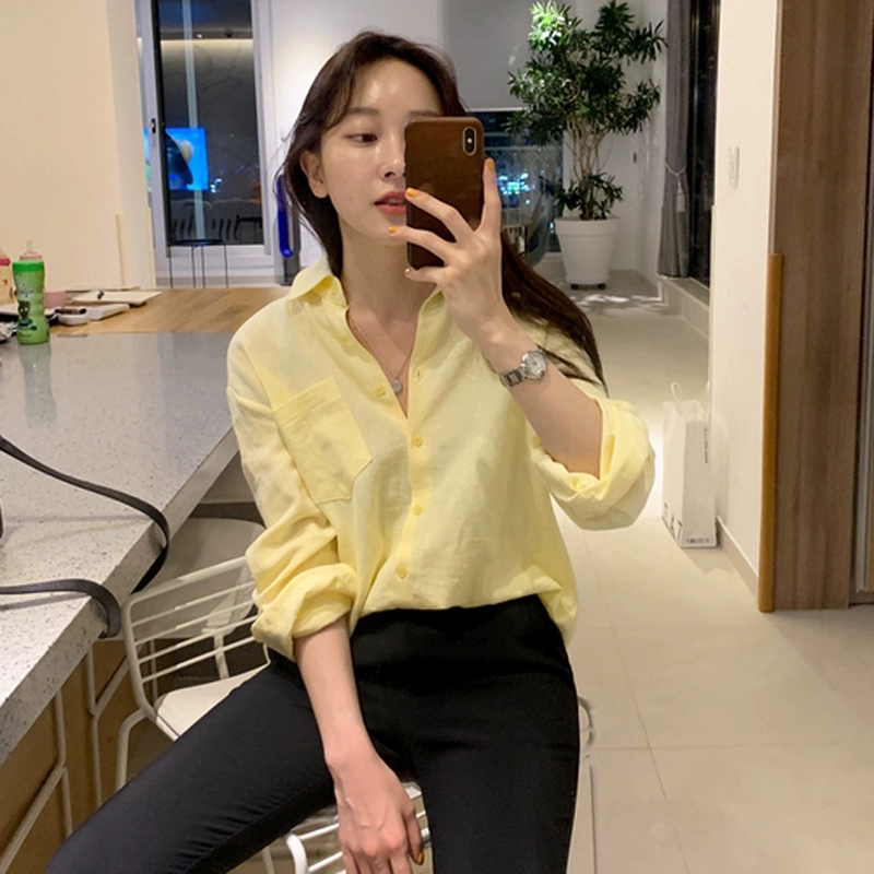 New spring and autumn slimming and stylish lemon yellow long-sleeved shirt