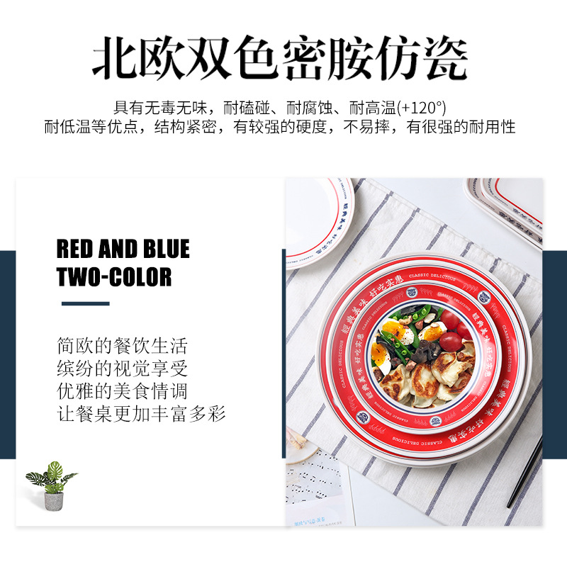 OF9DA5 red and blue two-color melamine plate commercial round plastic dish disc ins style imitation porcelain flat plate tableware