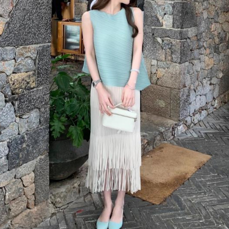 YUXAN2024 New Style Fixed Dye White Elegant Lazy Miyake Sleeveless Top Pleated Tassel Skirt for Women