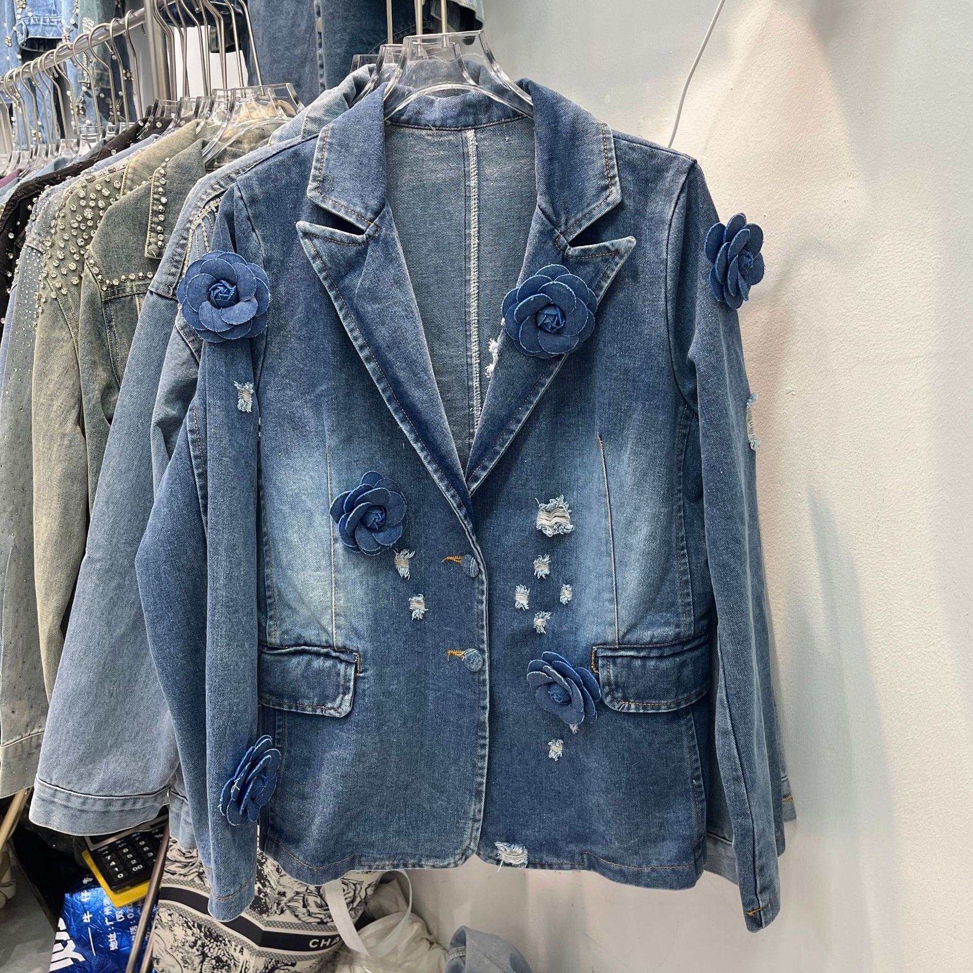 Design Sense Niche Denim Jacket Women’s Spring and Autumn New Old Rick Hole Three-dimensional Flower Decorative Casual Suit Top