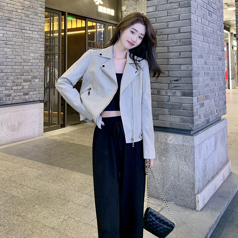 Real shot 2022 autumn Korean style creamy-white motorcycle PU leather coat women’s spring and autumn all-matching coat leather jacket short coat