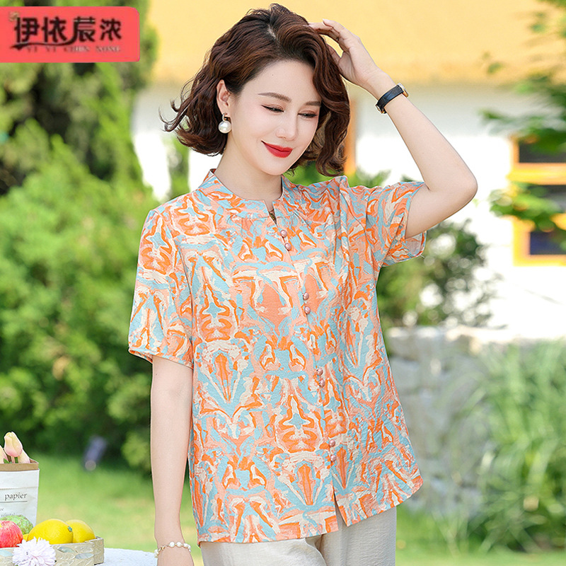 50-year-old mother’s summer lightweight breathable short-sleeved T-shirt 2024 summer new middle-aged women’s cool print shirt