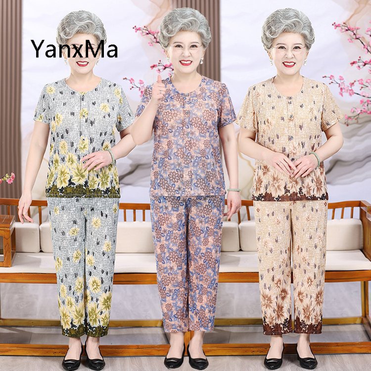 2023 Summer Suit for Middle-aged and Elderly Women’s Mother Clothes Ice Silk Shirt Grandma’s Summer T-shirt Short-sleeved Top for Old Lady