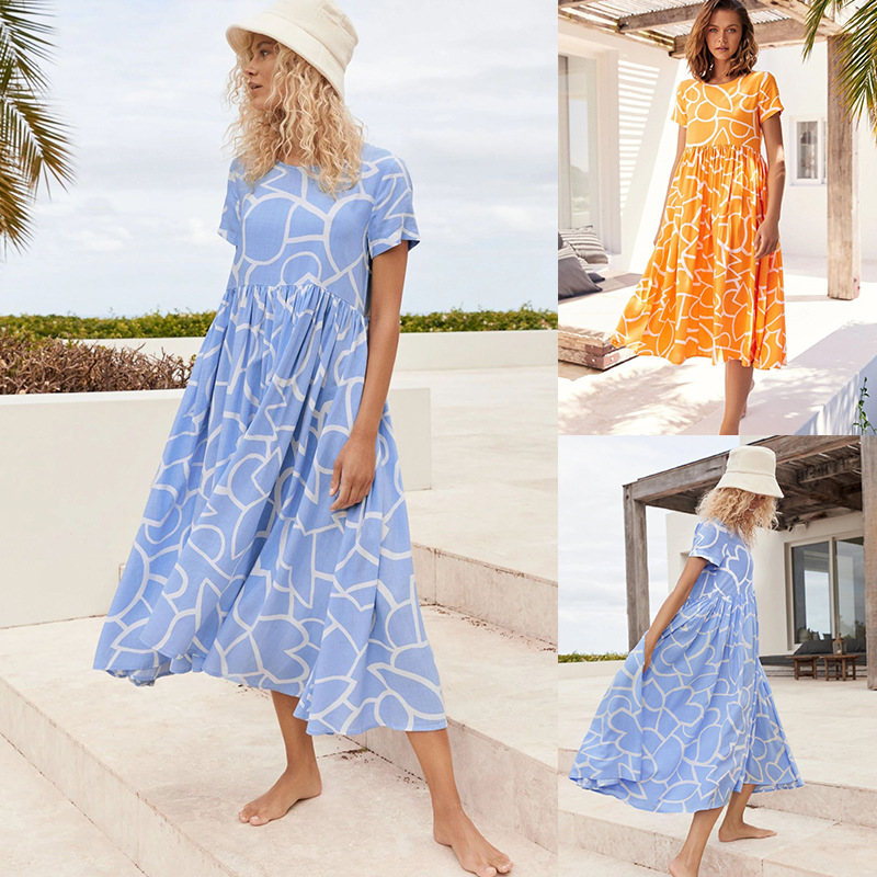 Cross-border foreign trade European and American women’s clothing Amazon 2023 spring and summer fashion temperament round neck short sleeve loose large swing dress