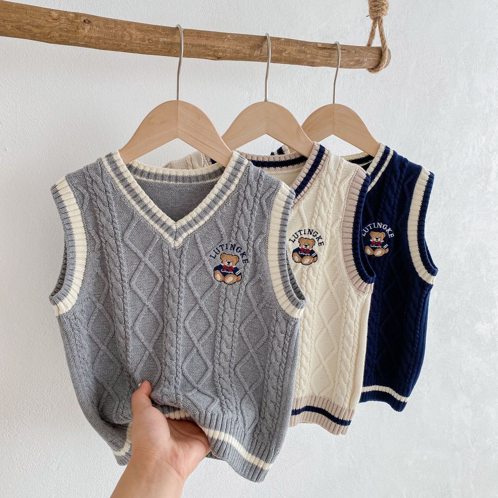 Boys Bear Needle New Rope Academy Style Knitted Vest 2024 Autumn and Winter Girls Cotton School Uniform Children’s Sweater