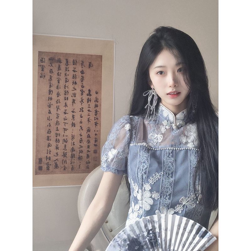 Cut bone blue cheongsam for Women summer 2023 new young fashionable long short sleeve lace temperament dress