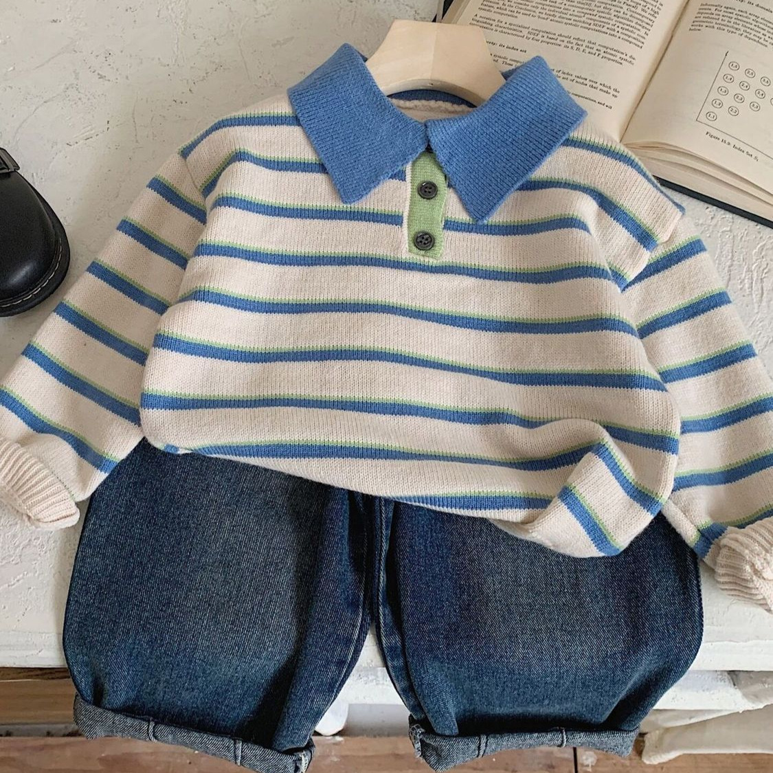 New Children’s Sweater 2024 Spring Striped Polo Shirt for Boys Korean Children’s Wear Pullover Knitted Top for Baby