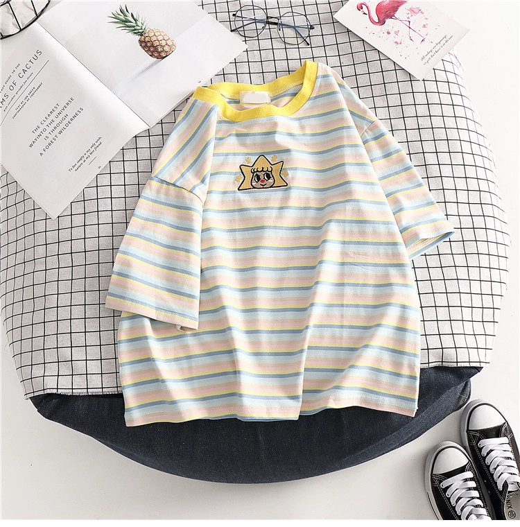 Super popular short-sleeved ins niche striped shoulder summer T-shirt