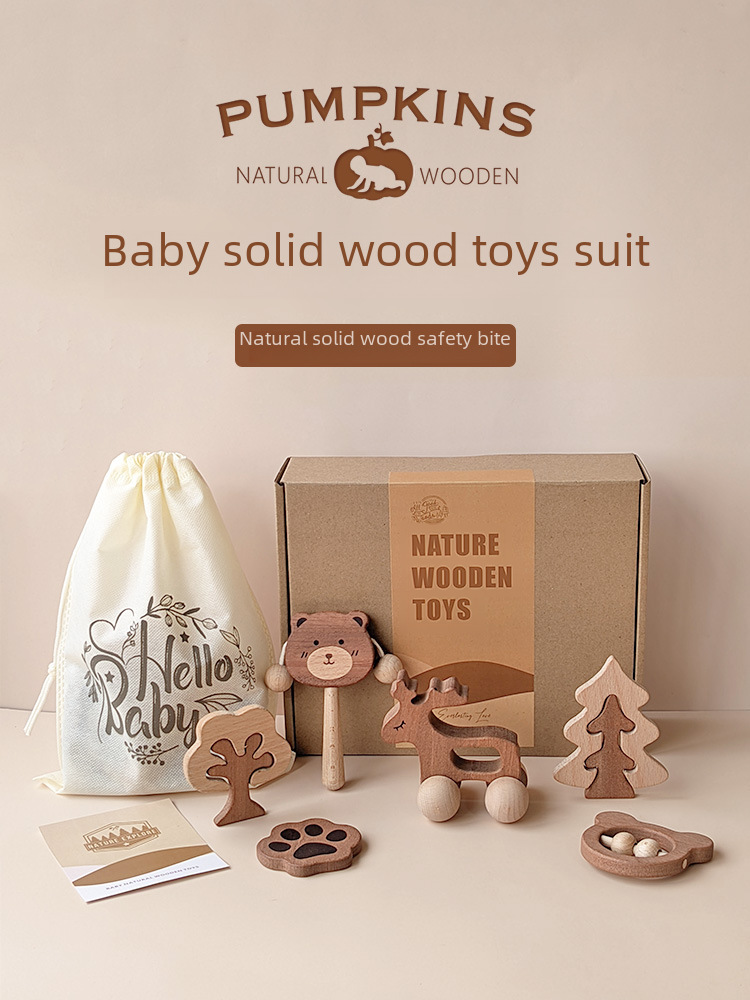 Newborn baby natural solid wood suit boxed Beech rattle car toy Bite Teether one hundred days old gift