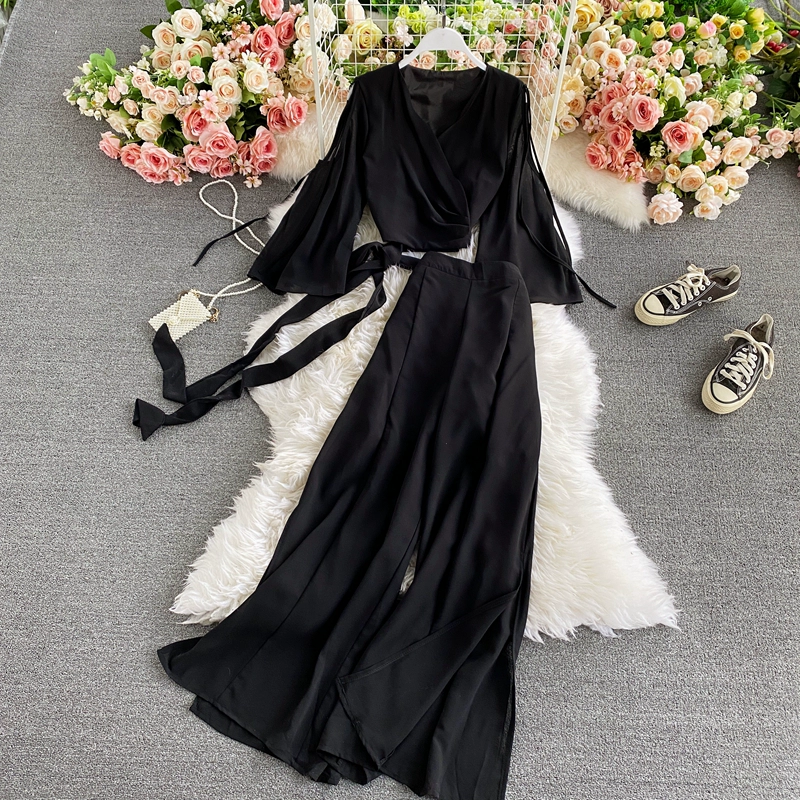 V-neck strappy waisted bell-sleeved wide-leg trousers top