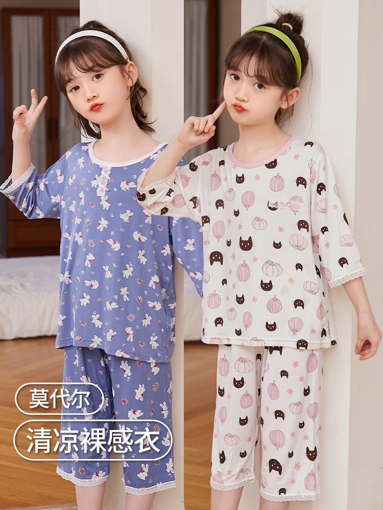 Children’s Pajamas Summer 2024 New Broken Lace Girls Cat Printed Air-conditioning Suit Two-piece Thin Fashionable Wholesale
